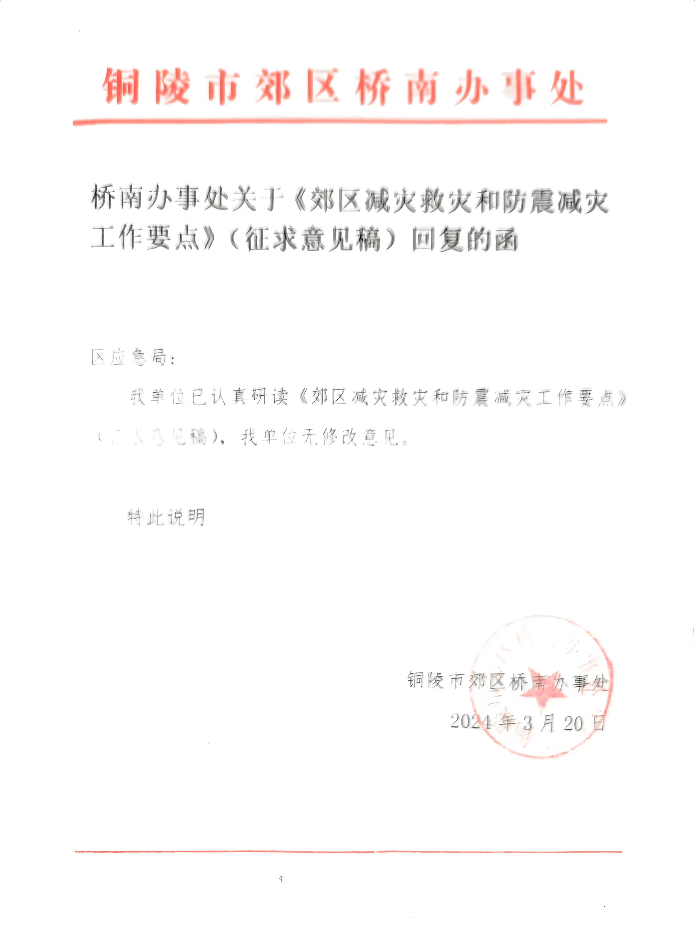 关于《铜陵市郊区减灾救灾和防震减灾2024年工作要点》征求意见稿的反馈