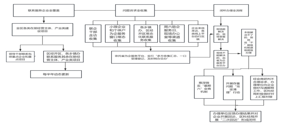 (三)闭环办理全流程。紧扣收集、办理、反馈、回访等环节,对企业诉求办理做到全过程管控、动态性跟踪、闭环式推进。(1)各级干部在专项行动中对企业问题诉求现场能解决的,按首问负责制要求,现场答复解决。(2)现场不能解决的,按照《铜陵市企业诉求办理说提级管理实施办法》要求,提交区科经局进行研判并协调解决。(3对某些不合理的企业诉求经组织会商研判后,由区科经局反馈给办理单位,办理单位及时向企业做好沟通解释工作。4)对区内解决不了的、需要市相关部门协调办理的诉求,由区营商环境办向市营商环境办汇报对接。(5)各诉求办理单位办理完毕要及时向企业反馈办理结果,并对企业开展回访,区科经局在审核办结前对企业实行二次回访,形成闭环。